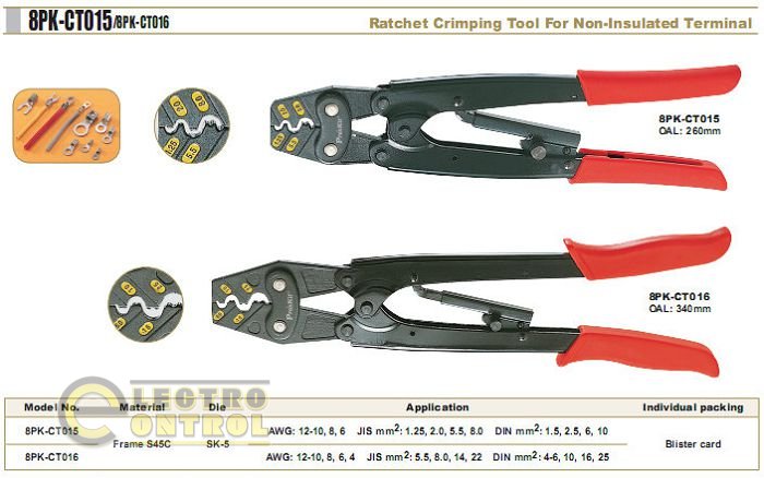 Область применения 8PK-CT015Кримпер используется для для опрессовки неизолированных гаечных клемм AWG: 12-10, 8, 6; JIS: 1.25, 2.0, 5.5, 8.0 мм²; DIN: 1.5, 2.5, 6, 10 мм².