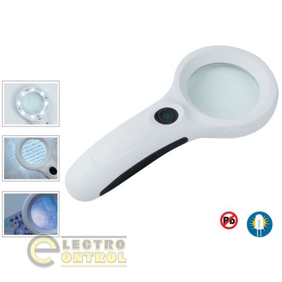 Стеклянная линза (ø 56 мм) в пластиковом корпусе с круговой светодиодной подсветкой, не дающей тени и бликов. Кнопка включения/выключения подсветки. Легкий и компактный инструмент. 8 светодиодов + 1 ультрафиолетовый для проверки кредитных карт и подлинности купюр. Поставляется в блистерной упаковке.