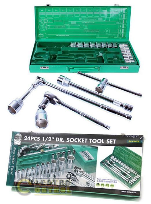 Набор из 24 предметов. Изготовлен из высококачественной хромванадиевой стали. Включает в себя трещоточный реверсивный ключ с 72 зубьями, универсальный шарнир, переходник, удлинители, рукоятки, глубокие насадки и сменные торцовые головки. Поставляется в прочном металлическом кейсе.