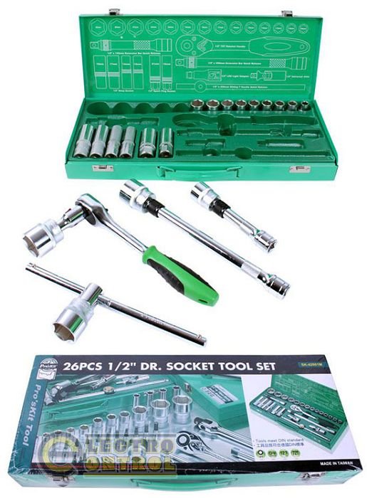 Набор из 26 предметов. Изготовлен из высококачественной хромванадиевой стали. Включает в себя трещоточный реверсивный ключ с 72 зубьями, универсальный шарнир, переходник, удлинители, рукоятки, глубокие насадки, светодиодный адаптер, магнитные насадки для свечей зажигания и сменные торцовые головки. Поставляется в прочном металлическом кейсе.