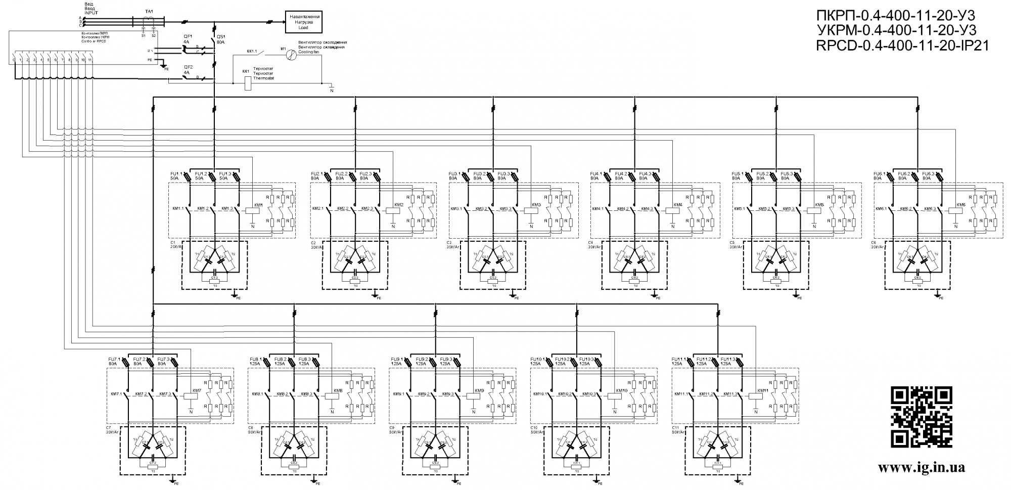 -конденсаторне устаткування укрп 0,4 кВ 400 кВар УКРП - 0.4 - 400 - 11 - 20 УЗ заснована на використанні високоякісних компонентів та виробничих потужностів. Вони підвищують ефективність роботи розподільчих мереж і забезпечують більшу надійність.