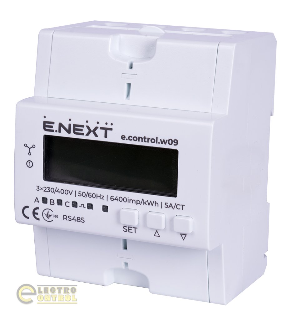 Трифазний лічильник e.control.w09 призначений для вимірювання активної/реактивної енергії змінного струму та інших змінних параметрів. Він може відображати напругу, струм, активну потужність, реактивну потужність, коефіцієнт потужності та частоту. Прилад обліку електроенергій має двоспрямований або односпрямований вимір енергії, а клемні затискачі можуть бути опломбовані. Він має порт RS485, що дозволяє дистанційно зчитувати параметри.