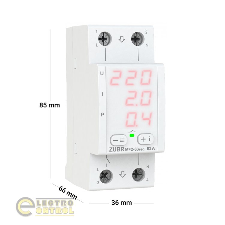 Мультифункціональне реле ZUBR MF2 red має компактний корпус шириною 2 модуля. Завдяки трьом цифровим екранам, одночасно відображає значення напруги, струму і потужності, що дуже зручно при контролі всіх параметрів одночасно. У режимі очікування доступна можливість налаштування яскравості екрану. У реле ZUBR MF2 red широкий функціонал, який об'єднав в собі: функції ZUBR CV2, контроль по струму і потужності ZUBR MF, а також можливість поглиблених налаштувань меж струму.