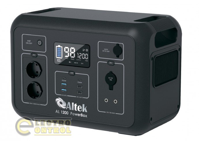ALTEK PowerBox AL 1200 – портативна станція, яка буде незамінною за відсутності електропостачання у приватних будинках, квартирах, на дачі, офісних приміщеннях, у польових умовах, під час активного відпочинку на природі, а також у подорожах. Сумісна з більшістю електронних пристроїв, таких як дрони, ноутбуки, ліхтарі, смартфони, планшети, камери, рації, мережеве обладнання, світлодіодні лампи, холодильники, телевізори та багато інших пристроїв.