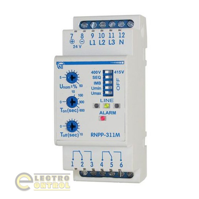 RNPP-311M (24В) здійснює контроль нуля непрямим методом. У виробі передбачені можливості регулювання параметрів (порогу спрацьовування за напругою, часу АПВ і часу затримки спрацьовування захисту), вибору напруги мережі, що контролюється (400 В або 415 В) і набору захисних функцій. Після відновлення параметрів напруги мережі виріб знову вмикає навантаження через час АПВ.