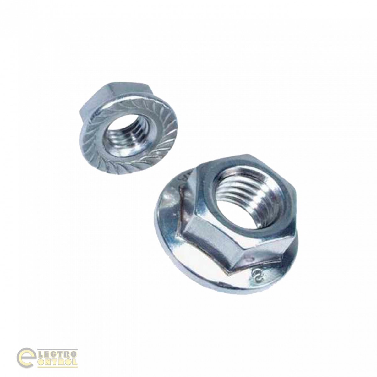 Гайка фланцева зубчаста М8 виготовлена з якісної сталі з оцинкованим покриттям. Застосовується у ремонті, машинобудуванні, для кріплення сонячних батарей.