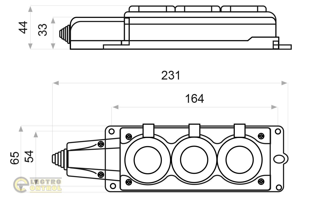 Колодка каучукова 2Р+PE з захисними кришками тримісна 16А IP44