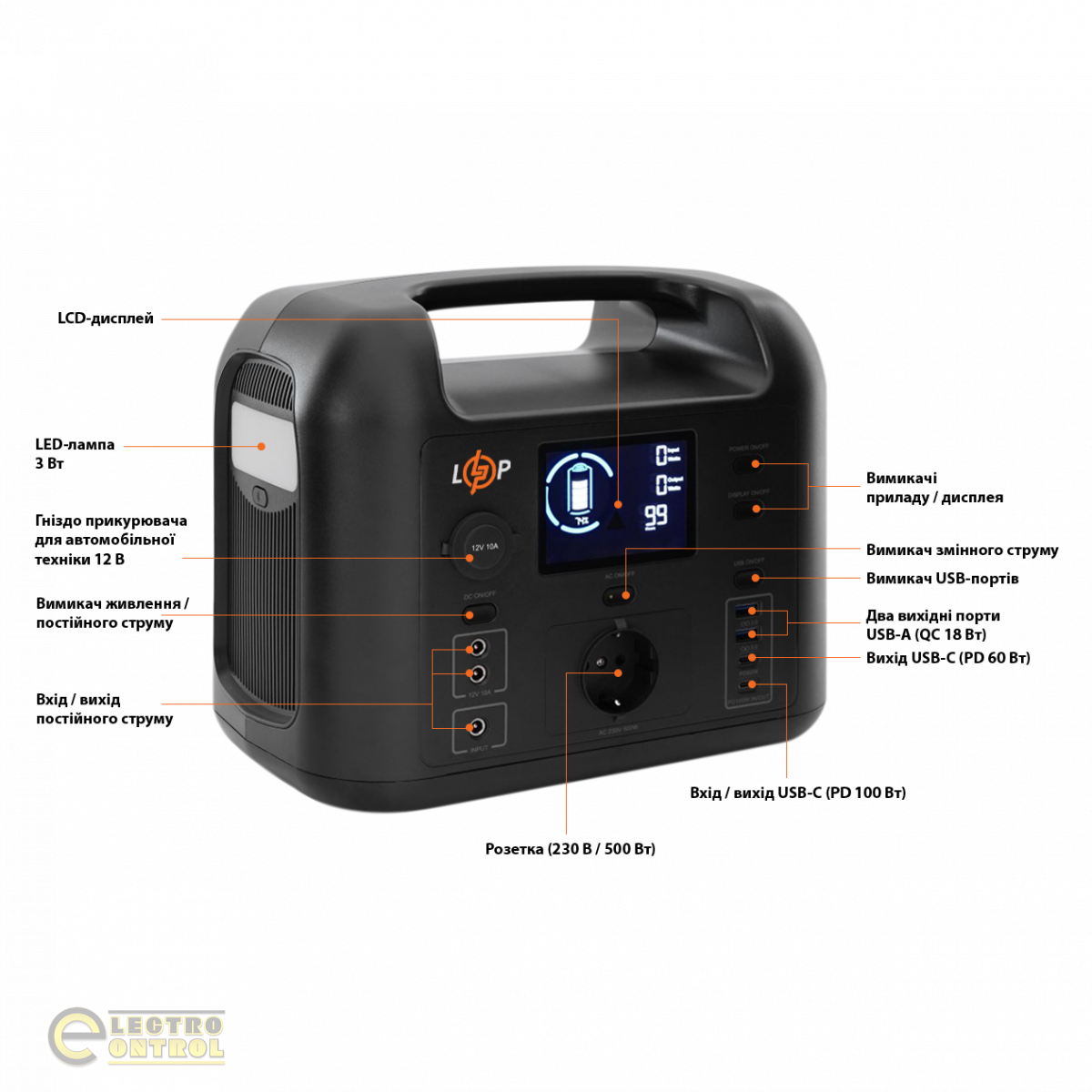Багатофункціональна портативна зарядна станція LogicPower LP CHARGER 500 (500W, 518Wh)