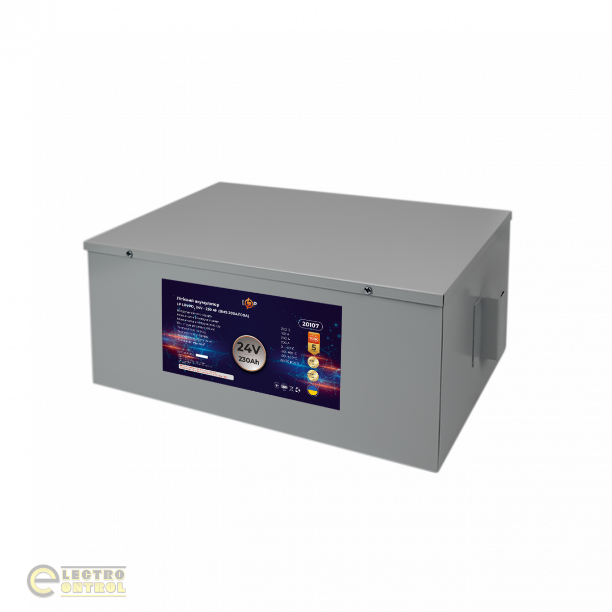 Літій-залізо-фосфатний акумулятор LP LiFePO4 24V - 230 Ah (BMS 200A/100A) метал. Зовнішня установка, має високу щільність енергії, відсутність шкідливих випарів і служить надійним і потужним джерелом електричної енергії. Відрізняється великим терміном служби та має до 7000 робочих циклів. Ми рекомендуємо їх для використання, де важливим є високий термін служби, висока ємність і надійність. Термін служби до 15 років.