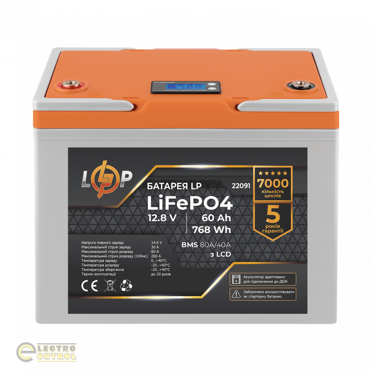 Акумулятор LP LiFePO4 12,8V - 60 Ah (768Wh) (BMS 80A/40А) пластик LCD