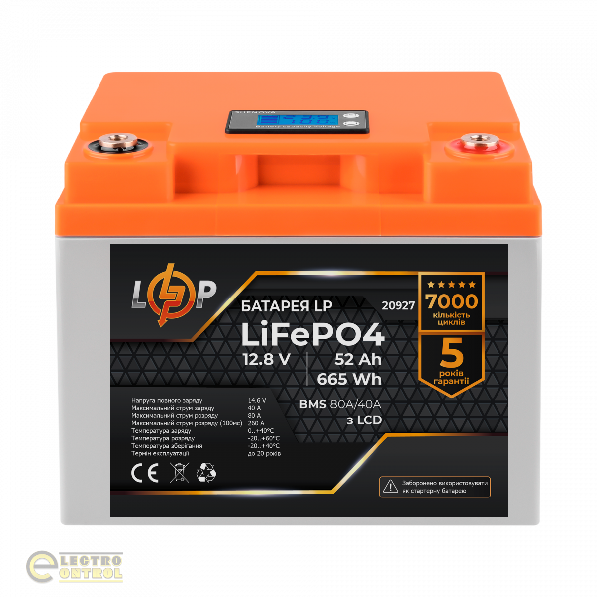 Акумулятор LP LiFePO4 LCD 12V (12,8V) - 52 Ah (665Wh) (BMS 80A/40А) пластик
