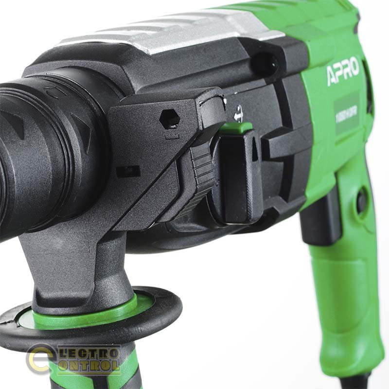 - Мережевий перфоратор для дому APRO 896229 має захисну муфту, яка дає можливість захистити Вас від травм, у разі якщо оснащення дасть збій. Це робить роботу більш безпечною. Кнопка блокування увімкнення розташовується на корпусі інструмента і дає змогу унеможливити випадкове натискання кнопки "спуску".