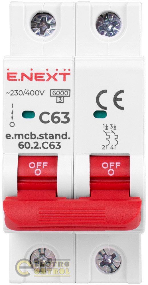 Для промислових і побутових застосувань можуть бути використані модульні автоматичні вимикачі Enext. Вони можуть захищати ланцюги змінного струму напругою від перевантаження та коротких замикань (струмів короткої дії), також мають можливість оперативного вмикання/вимикання їх на об'єктах будь-якої площі. Вимикач Enext серій - e.mcb.stand.60 спроектований для роботи з номінальними струмами до 6кА, категорія спрацьовування: C, число полюсів: двополюсний 2р артикул: s002123, здатність відключення: 6кА