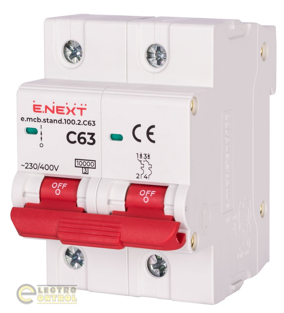 Для промислових і побутових застосувань можуть бути використані модульні автоматичні вимикачі Enext. Вони можуть захищати ланцюги змінного струму напругою від перевантаження та коротких замикань (струмів короткої дії), також мають можливість оперативного вмикання/вимикання їх на об'єктах будь-якої площі. Вимикач Enext серій - e.mcb.stand.100 спроектований для роботи з номінальними струмами до 10кА, категорія спрацьовування: C, число полюсів: двополюсний 2р артикул: s002208, здатність відключення: 10кА