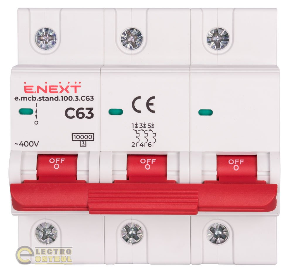 Для промислових і побутових застосувань можуть бути використані модульні автоматичні вимикачі Enext. Вони можуть захищати ланцюги змінного струму напругою від перевантаження та коротких замикань (струмів короткої дії), також мають можливість оперативного вмикання/вимикання їх на об'єктах будь-якої площі. Вимикач Enext серій - e.mcb.stand.100 спроектований для роботи з номінальними струмами до 10кА, категорія спрацьовування: C, число полюсів: триполюсний 3р артикул: s002212, здатність відключення: 10кА
