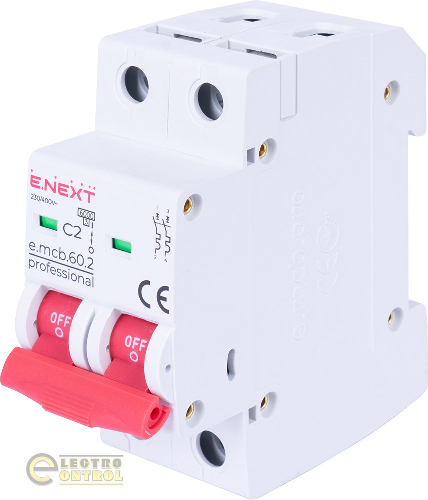 Для промислових і побутових застосувань можуть бути використані модульні автоматичні вимикачі Enext. Вони можуть захищати ланцюги змінного струму напругою від перевантаження та коротких замикань (струмів короткої дії), також мають можливість оперативного вмикання/вимикання їх на об'єктах будь-якої площі. Вимикач Enext серій - e.mcb.pro.60 спроектований для роботи з номінальними струмами до 6кА, категорія спрацьовування: C, число полюсів: двополюсний 2р артикул: p042042, здатність відключення: 6кА