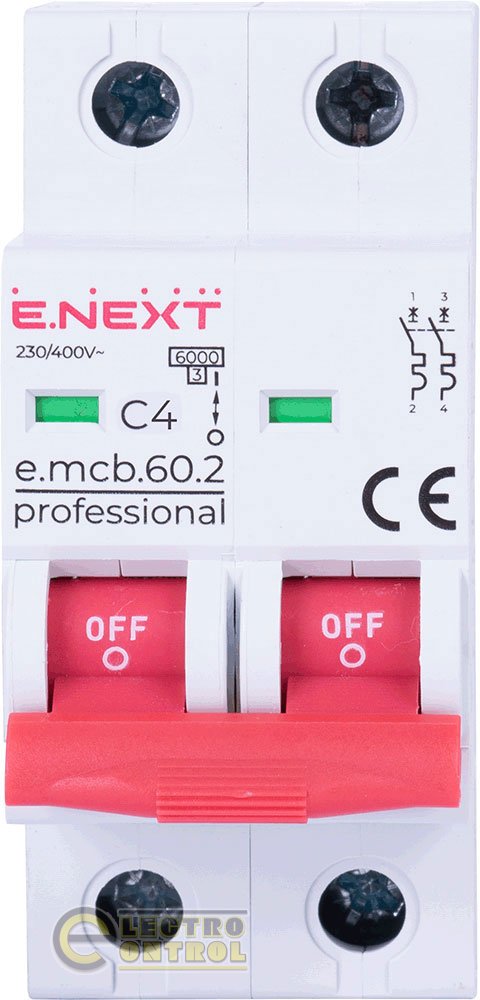 Для промислових і побутових застосувань можуть бути використані модульні автоматичні вимикачі Enext. Вони можуть захищати ланцюги змінного струму напругою від перевантаження та коротких замикань (струмів короткої дії), також мають можливість оперативного вмикання/вимикання їх на об'єктах будь-якої площі. Вимикач Enext серій - e.mcb.pro.60 спроектований для роботи з номінальними струмами до 6кА, категорія спрацьовування: C, число полюсів: двополюсний 2р артикул: p042044, здатність відключення: 6кА