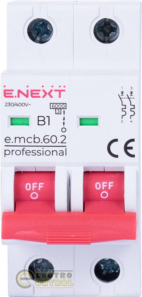 Для промислових і побутових застосувань можуть бути використані модульні автоматичні вимикачі Enext. Вони можуть захищати ланцюги змінного струму напругою від перевантаження та коротких замикань (струмів короткої дії), також мають можливість оперативного вмикання/вимикання їх на об'єктах будь-якої площі. Вимикач Enext серій - e.mcb.pro.60 спроектований для роботи з номінальними струмами до 6кА, категорія спрацьовування: В, число полюсів: двополюсний 2р артикул: p041033, здатність відключення: 6кА