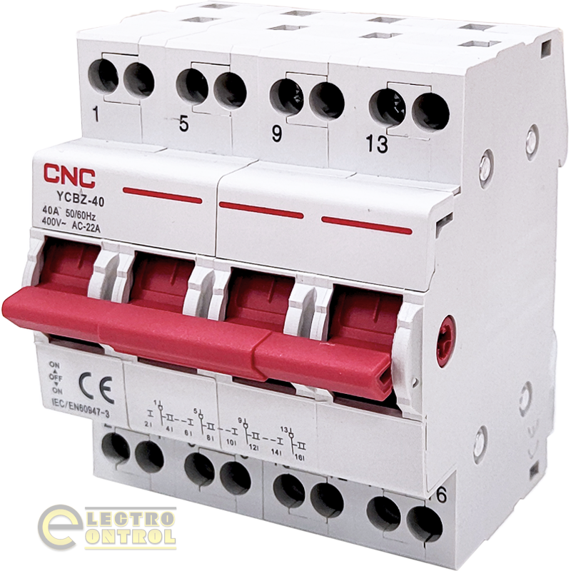 Модульні перемикачі навантаження YCBZ-40 (виробник «CNC ELECTRIC GROUP CO., LTD») призначені для оперативного перемикання джерела живлення (мережа-генератор) в електричних колах змінного струму частотою 50/60Гц напругою до 240/415В. Пристрій має загальний верхній контакт та рукоятку керування трипозиційним станом контактів (1-0-2). Конструкція та технічні характеристики перемикачів навантаження відповідають ДСТУ EN 60947-3 та вимогам діючих стандартів з електромагнітної сумісності обладнання.