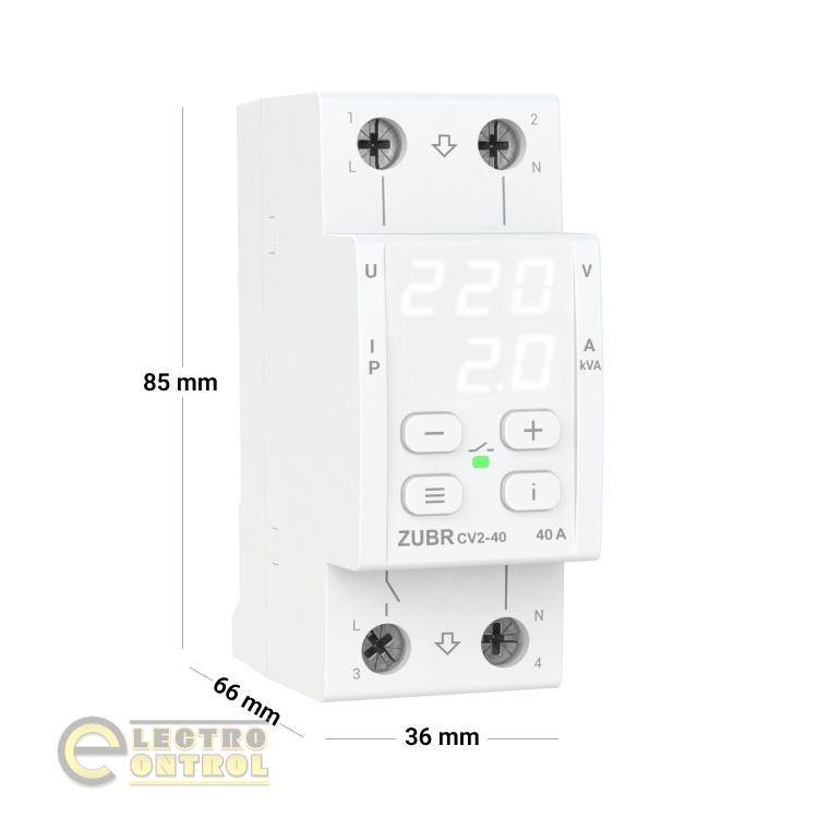 ZUBR CV2 захищає обладнання від високої та низької напруги, обриву нуля, а також обмежує споживання струму чи потужності. При відхиленнях напруги ZUBR вимкне навантаження, а при перевищенні струму або потужності навантаження відключиться через заданий час затримки.