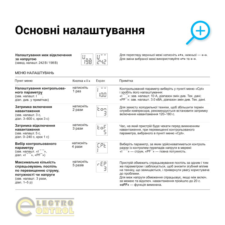 Налаштування роботи пристрою здійснюється за допомогою всього лише трьох кнопок. Четверна кнопка «i» призначена для перегляду журналу аварійних спрацьовувань, розшифровки абревіатур пунктів меню, а також всіх вимірюваних параметрів. Цифровий екран постійно відображає значення напруги і струму або потужності, а також виводить системну інформацію. Доступна можливість налаштування яскравості екрану в режимі очікування.