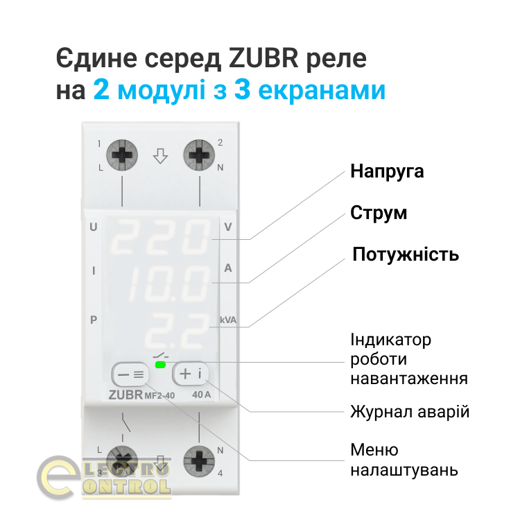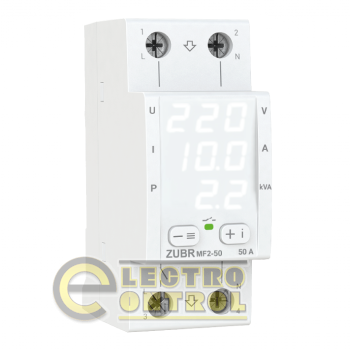 Мультифункціональне реле ZUBR MF2 має компактний корпус шириною 2 модуля. Завдяки трьом цифровим екранам, одночасно відображає значення напруги, струму і потужності, що дуже зручно при контролі всіх параметрів одночасно. У режимі очікування доступна можливість налаштування яскравості екрану. У реле ZUBR MF2 широкий функціонал, який об'єднав в собі: контроль напруги, струму та потужності, а також можливість поглиблених налаштувань.