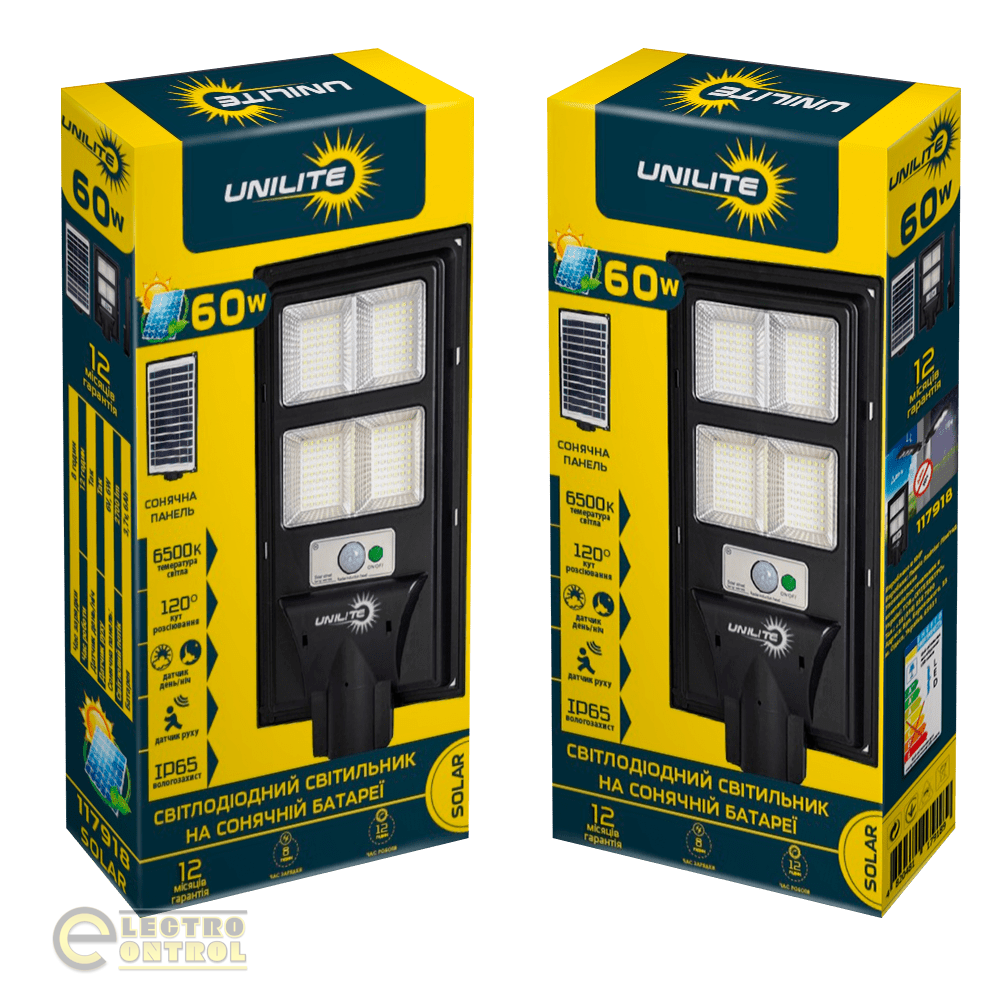 Світлодіодний вуличний світильник на сонячній батареї UNILITE 60W 6500K (117918) і з дистанційним керуванням – Ваш надійний супутник у світі освітлення!