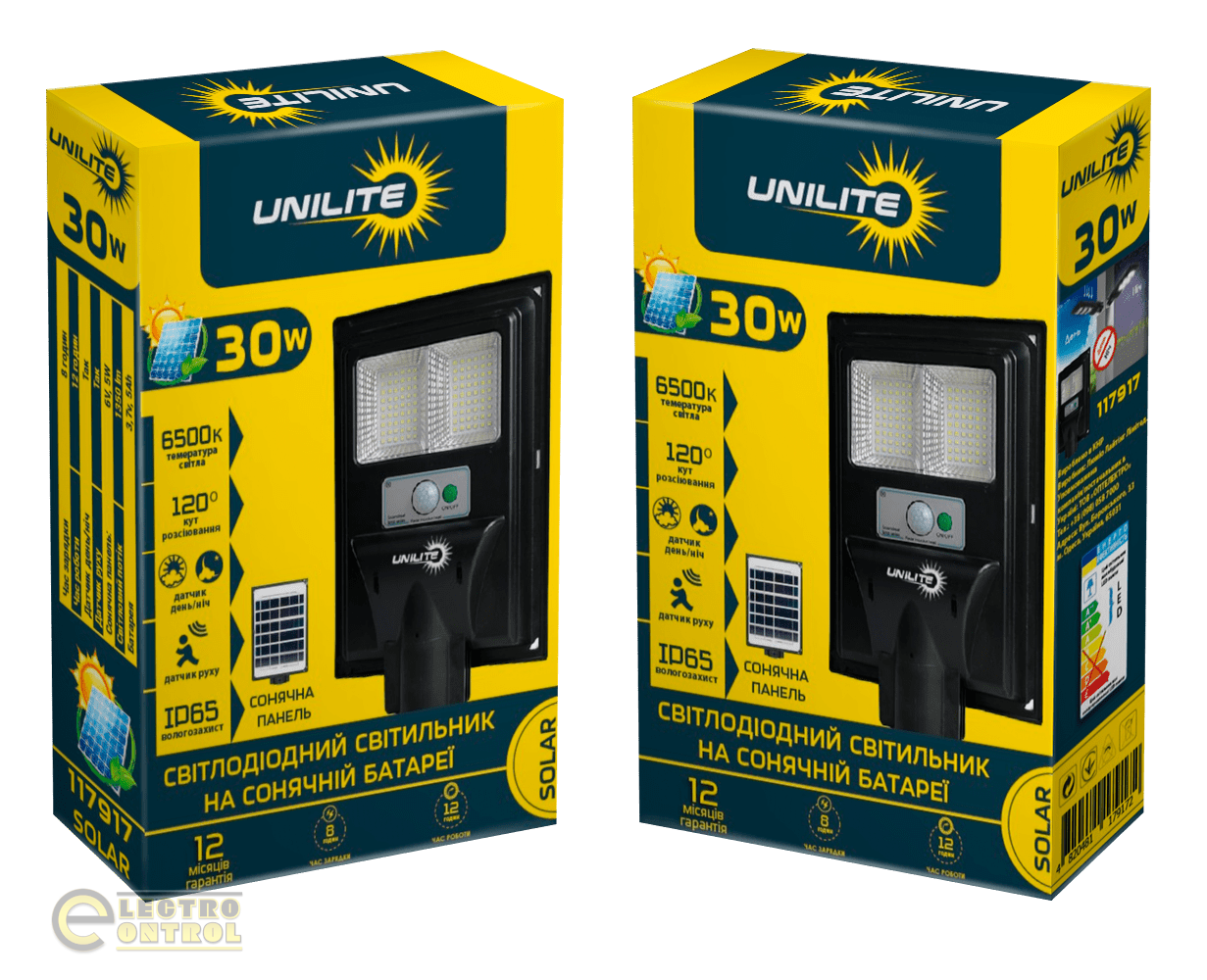 Світлодіодний вуличний світильник на сонячній батареї UNILITE 30W 6500K (117917) і з дистанційним керуванням – Ваш надійний супутник у світі освітлення!