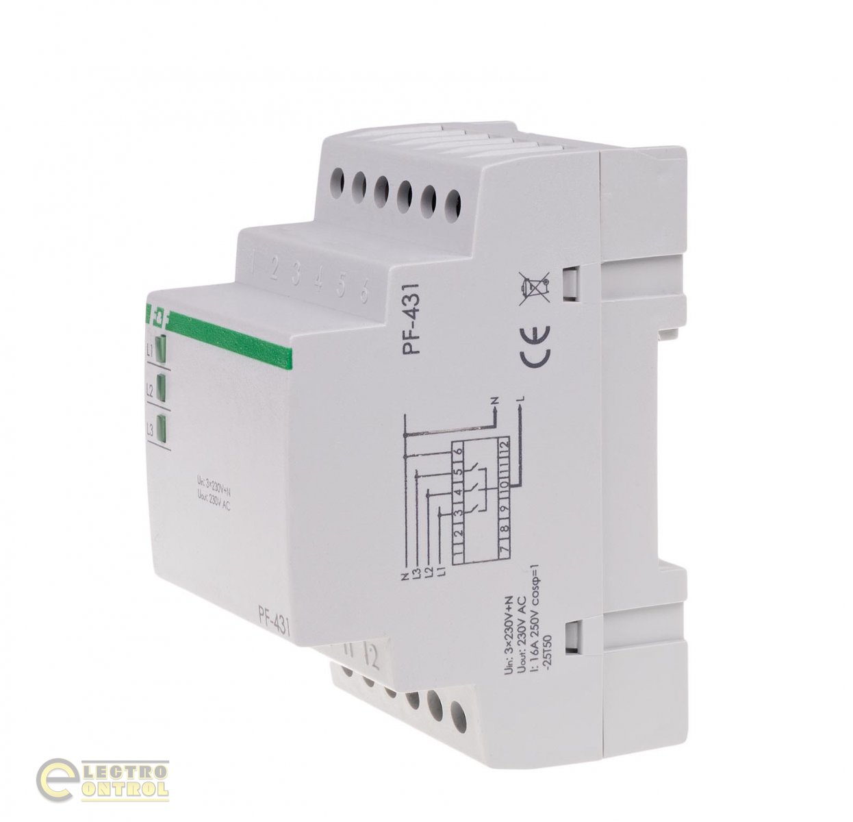 - Перемикач фаз автоматичний PF-431 призначений для резервного живлення однофазних споживачів від 3-х фазної мережі живлення, вибору справної фази та живлення навантаження від неї.