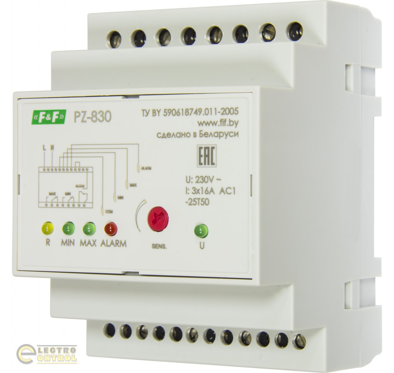 - PZ-830 призначений для контролю і підтримки заданого рівня струмопровідних рідин в резервуарах, басейнах, водонапірних вежах і т.п. і управління електродвигунами насосних установок.