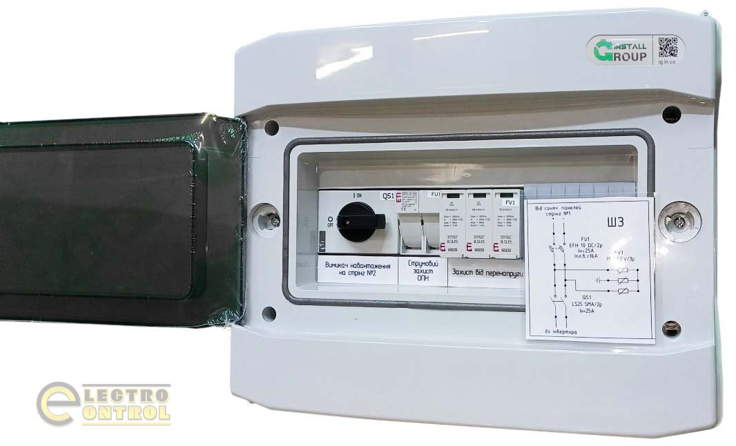 Компанія «Інсталл Групп» виготовляє щити захисту інвертора як базової комплектації, так і індивідуально для кожного проекту. Щити захисту можуть бути виконані для різної потужності обладнання сонячної станції, різної кількості стрингів, для використання в електросистемах постійного або змінного струму.