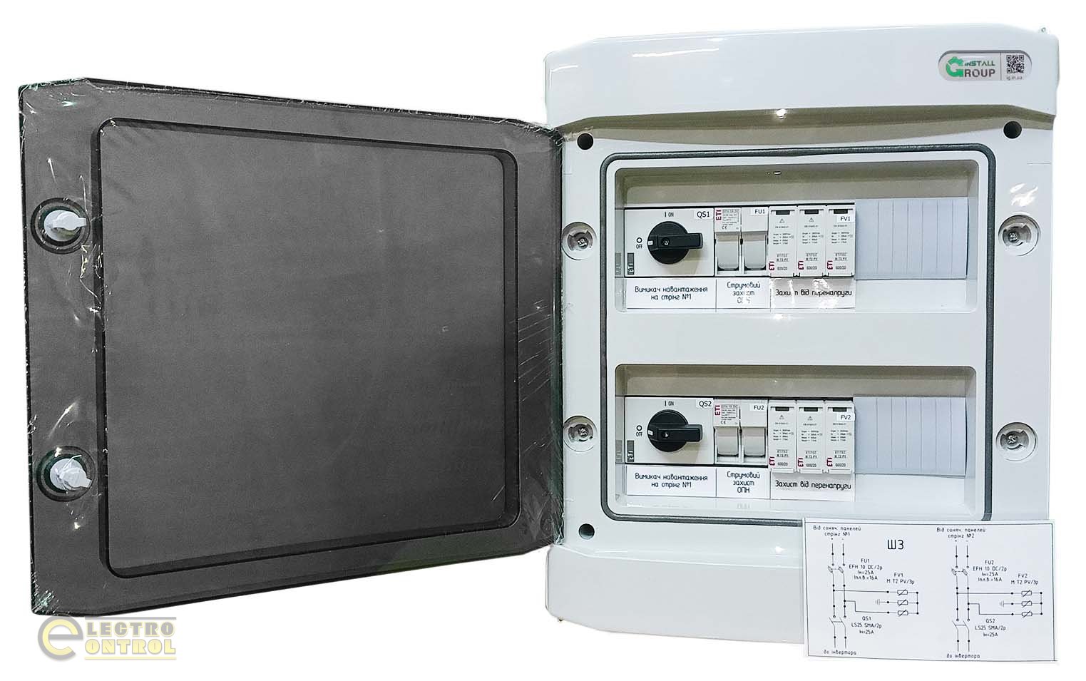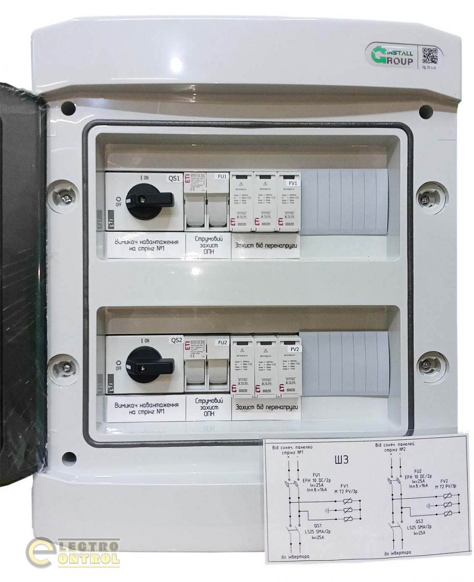 Компанія «Інсталл Групп» виготовляє щити захисту інвертора як базової комплектації, так і індивідуально для кожного проекту. Щити захисту можуть бути виконані для різної потужності обладнання сонячної станції, різної кількості стрингів, для використання в електросистемах постійного або змінного струму.