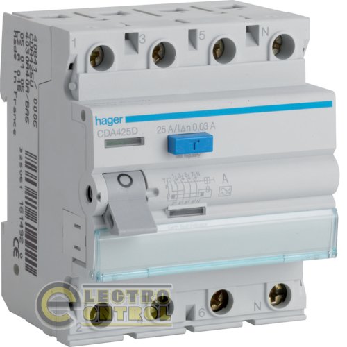 Пристрій захисного відключення (ПЗВ) Hager CDA425D 4P 6kA 25A 30mA A