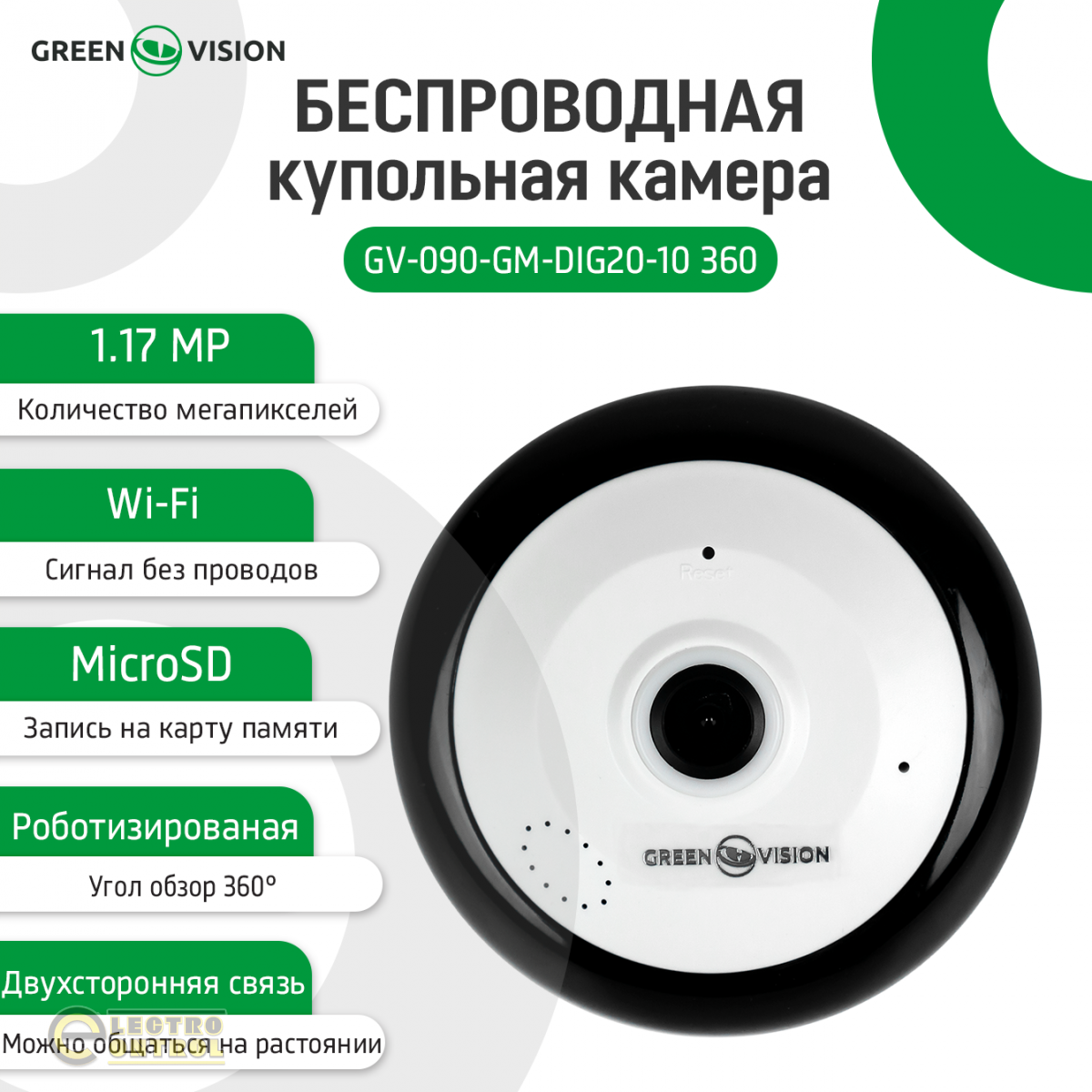 Wi-Fi камера GV-090-GM-DIG20-10 360 від української торгової марки GreenVision розроблена із застосуванням інноваційних технологій для встановлення всередині приміщень. Однією з важливих переваг представленої моделі є її мобільність та простота монтажу. При необхідності, Wi-Fi камеру можна легко перевстановити, приховати від сторонніх очей тощо.
