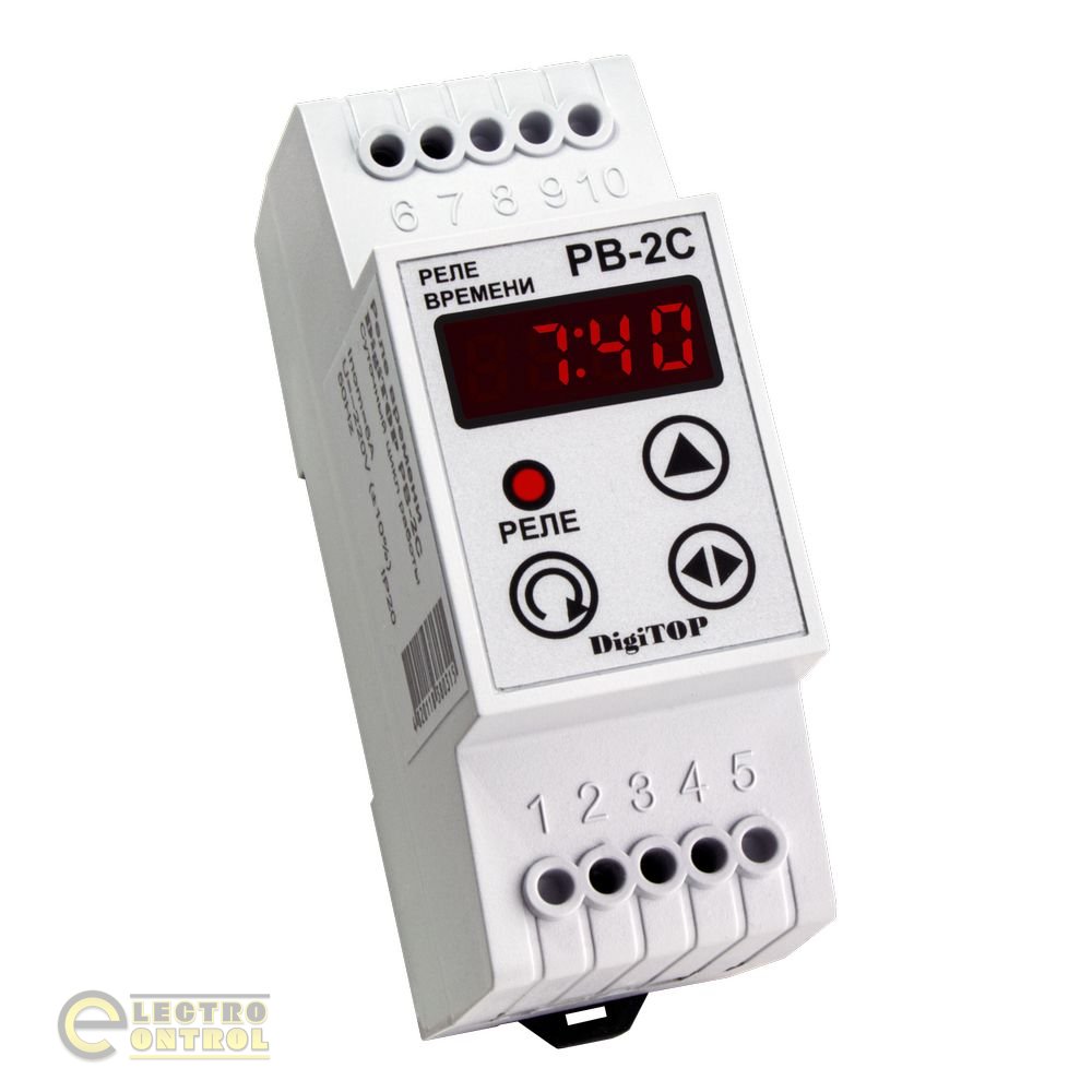 Реле часу РВ-2С призначене для автоматичного включення і відключення виконавчих пристроїв (системи поливу, освітлення і т.д.) в задані користувачем моменти астрономічного (реального) часу. Реле часу має добовий цикл роботи. Користувач може встановити до 99 міток (вмикання або вимикання) на добу.