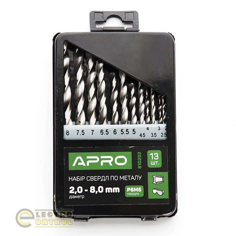 Набір свердел по металу APRO Р6М5 810202 2,0–8,0мм 13шт метал бокс