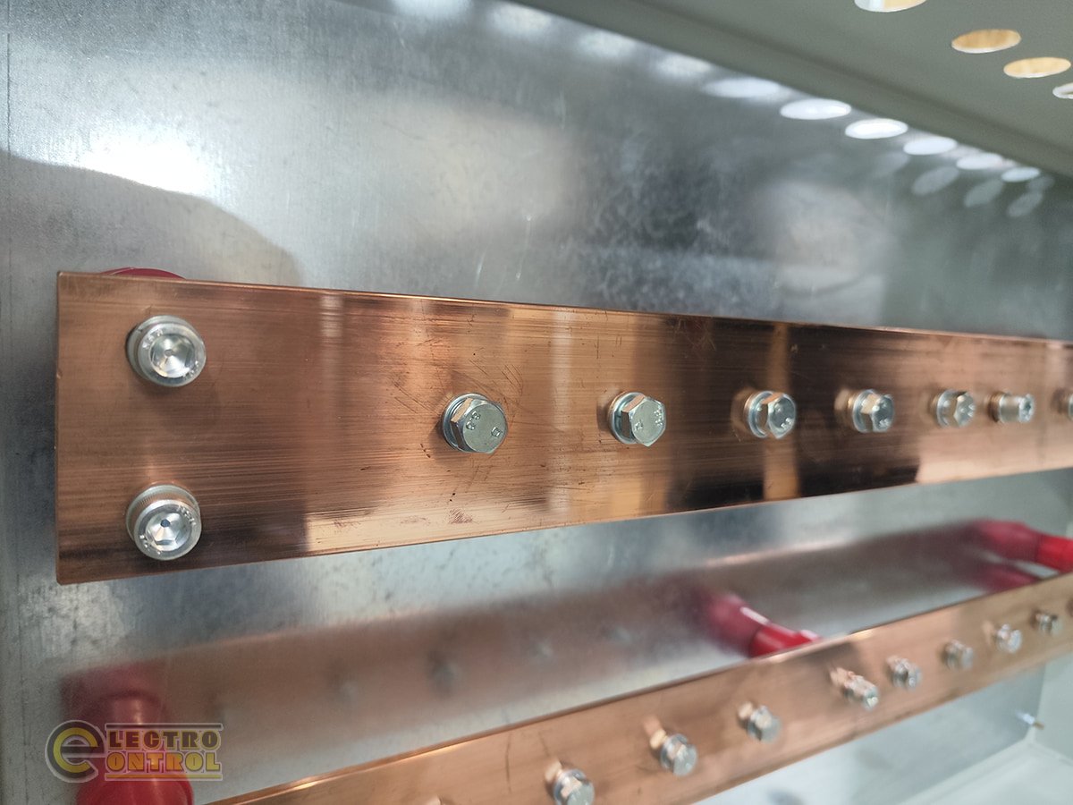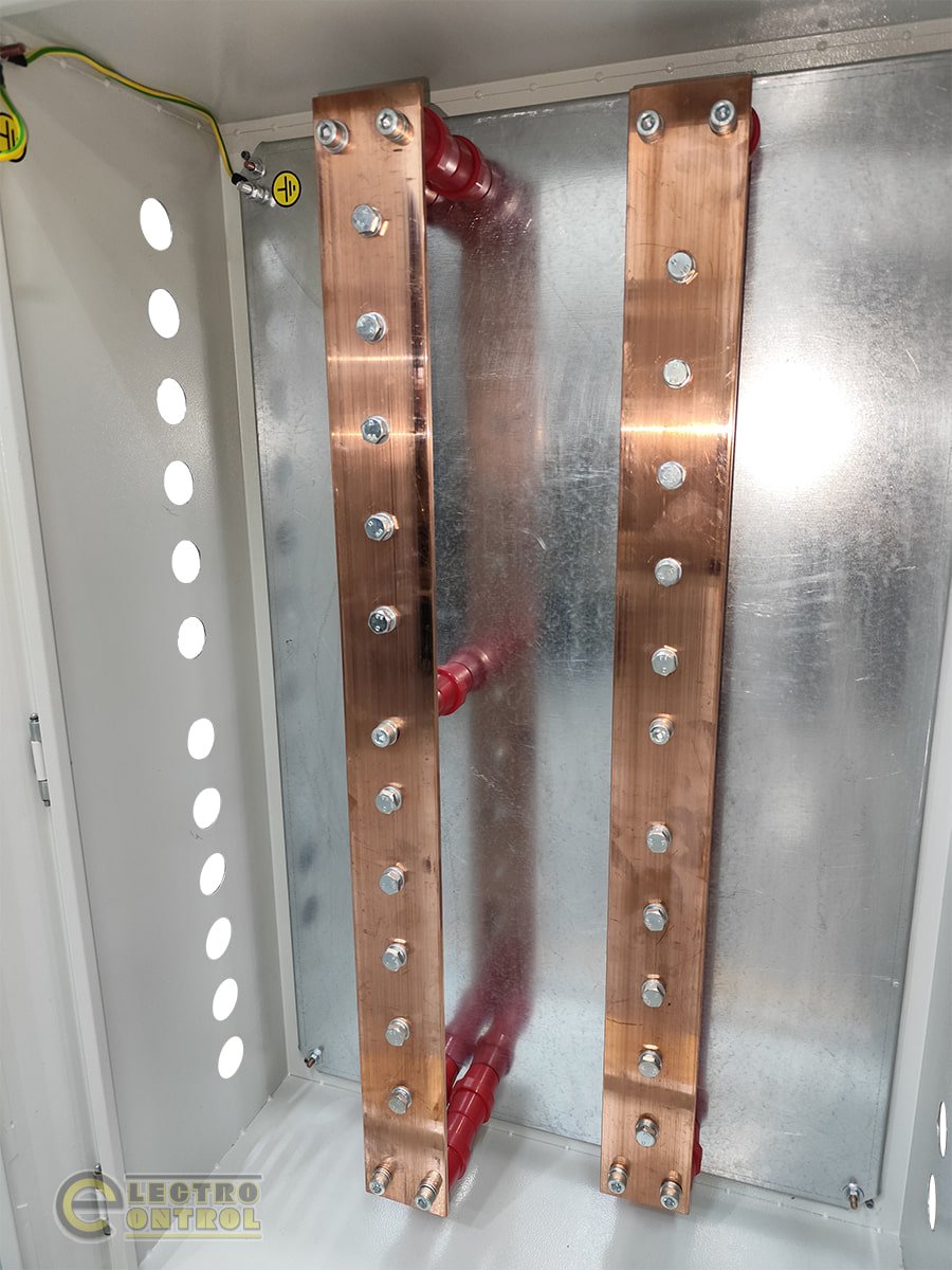⇒ мідні шини «+» і «-» - це основні елементи в щиті за допомогою яких відбувається під’єднання батерей до інверторів;