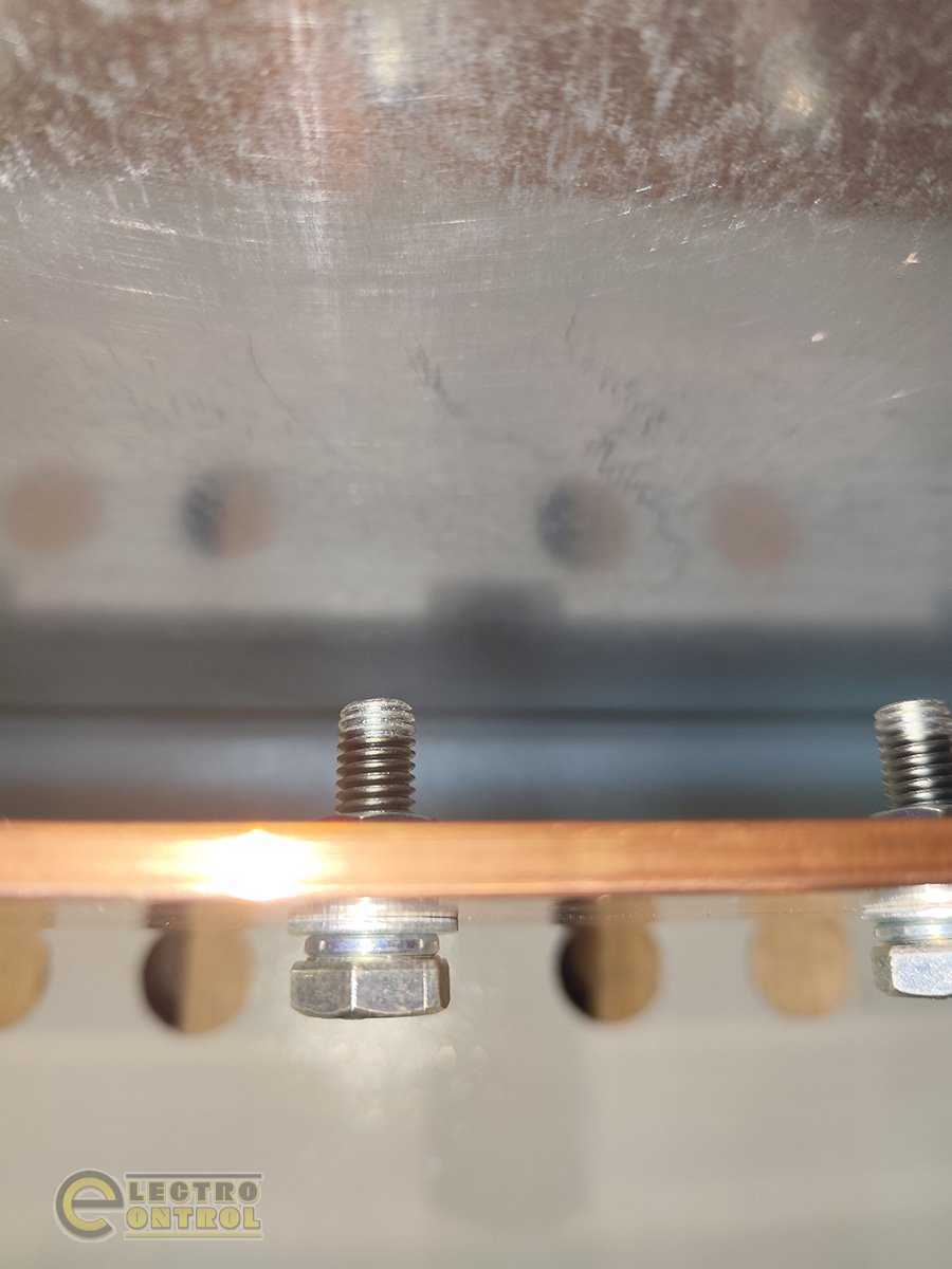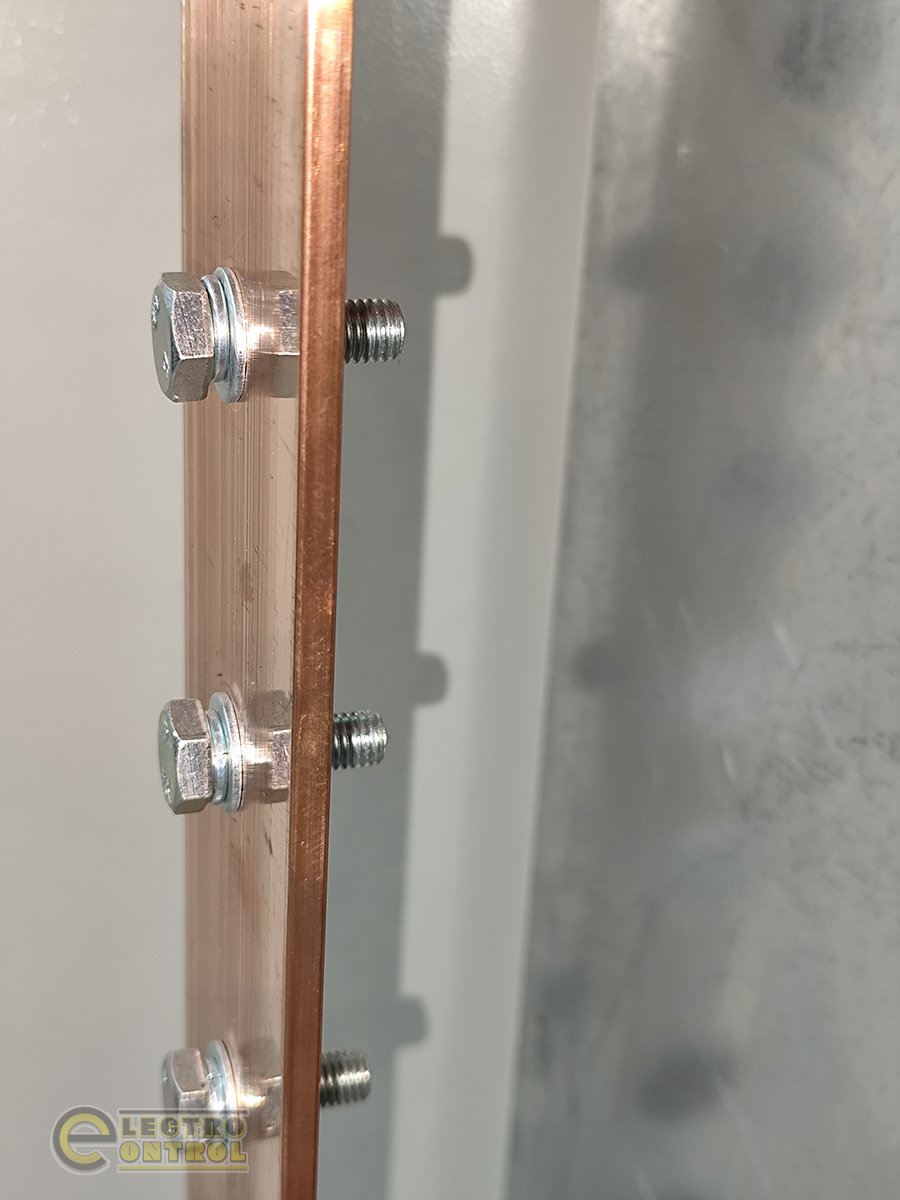 ⇒ спеціальні установочні гайки з прес-вкладишем – вони врізаються в мідну шину, забезпечуючи надійний електричний контакт та зрічність підключення кабелів без потреби додаткового сверління чи кріплення;