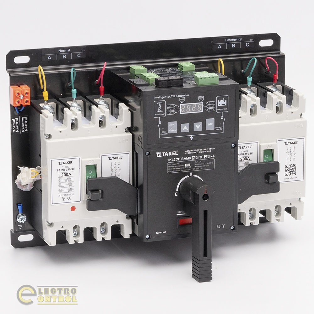 Автоматичний перемикач резервного живлення TKL2CB з автоматичним вимикачем ВАМ8 призначений для контролю електромереж. У разі збою основного живлення пристрій автоматично перемикається на резервне джерело живлення, а також подає команду на дизель-генератор на ввімкнення, забезпечуючи безперервність електропостачання.