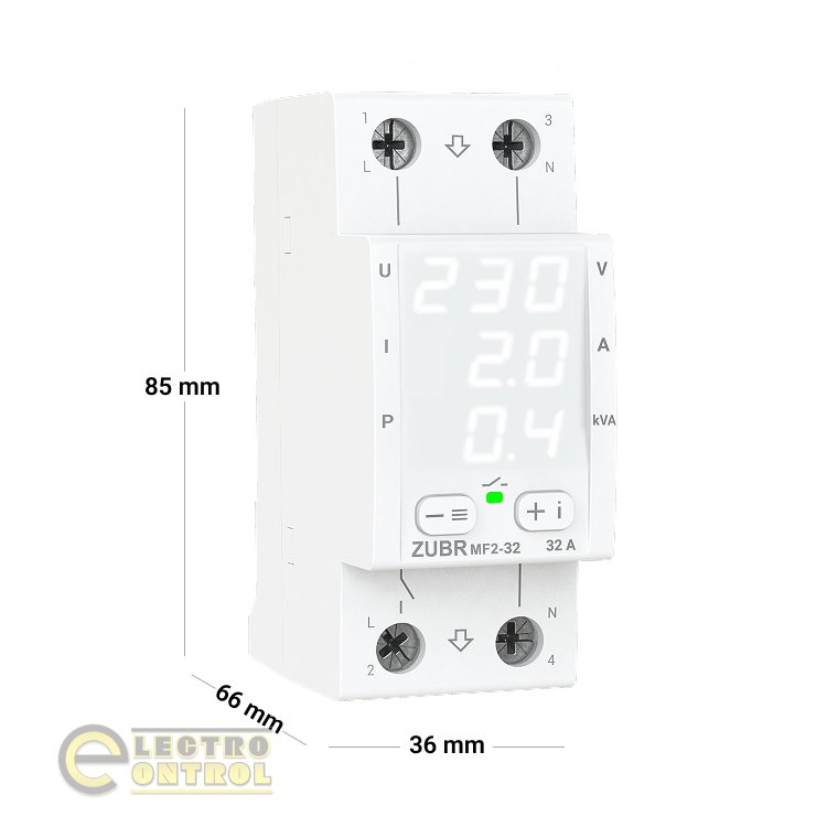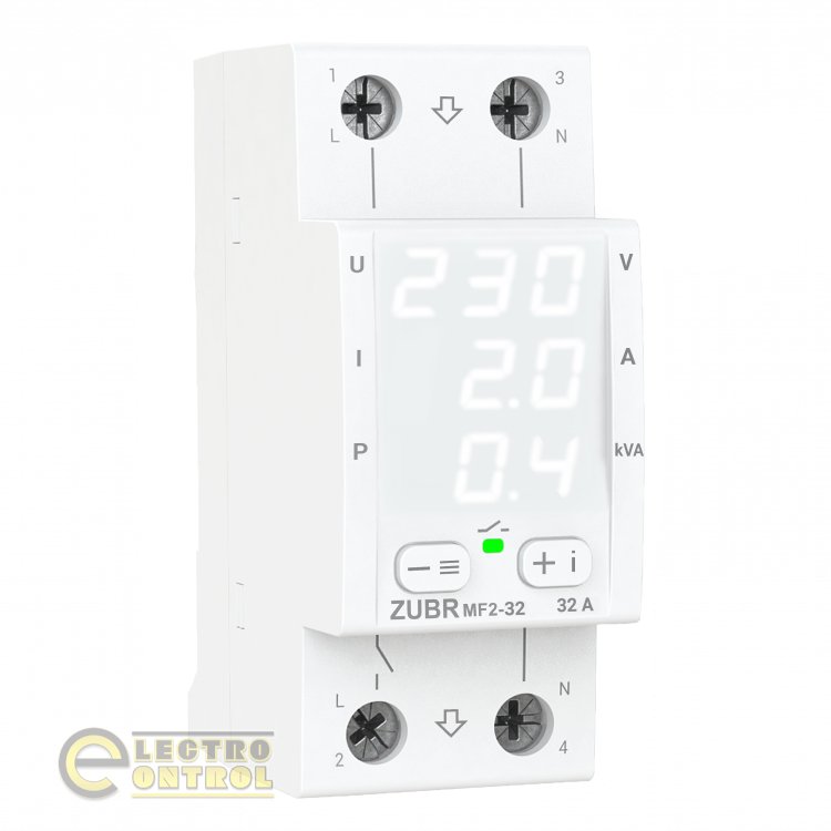 Мультифункціональне реле ZUBR MF2 має компактний корпус шириною 2 модуля. Завдяки трьом цифровим екранам, одночасно відображає значення напруги, струму і потужності, що дуже зручно при контролі всіх параметрів одночасно. У режимі очікування доступна можливість налаштування яскравості екрану. У реле ZUBR MF2 широкий функціонал, який об'єднав в собі: функції ZUBR CV2, контроль по струму і потужності ZUBR MF, а також можливість поглиблених налаштувань меж струму.