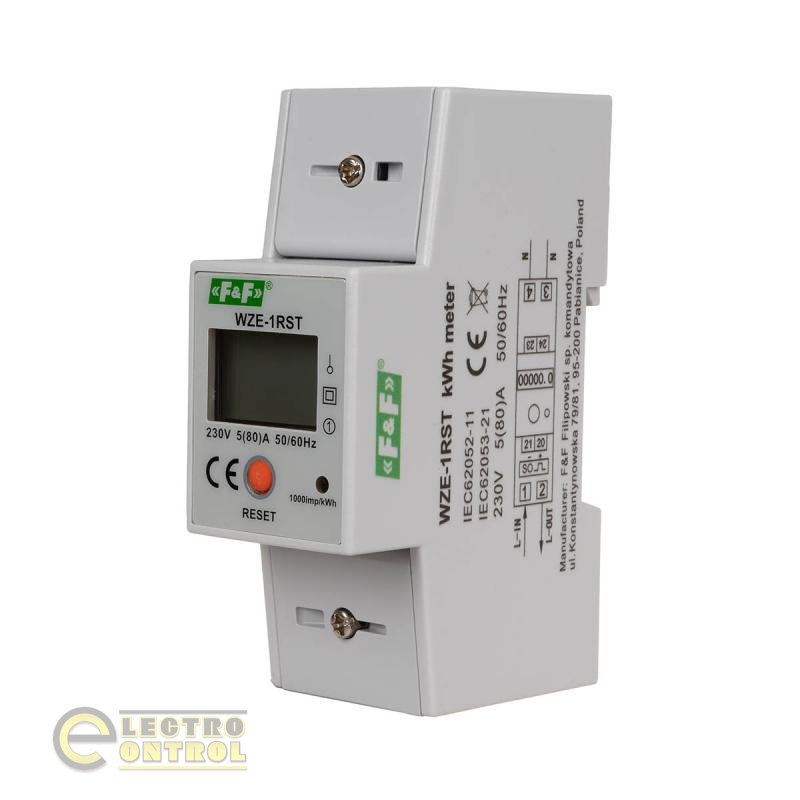 WZE-1RST є статичним (електронним) приладом для вимірювання споживання електроенергії однофазного змінного струму в прямій системі підключення. Він оснащений 2 індикаторами (строками) споживання енергії, що відображаються одночасно. Один показує загальне споживання енергії, а інший показує споживання енергії з моменту останнього скидання лічильника. Спеціальна електронна система під впливом струму і прикладеної напруги генерує імпульси в кількості, пропорційній споживаної електроенергії. Кількість спожитої енергії відображається на дисплеї лічильника. Крім того, споживання енергії відображається блимаючим червоним світлодіодом.