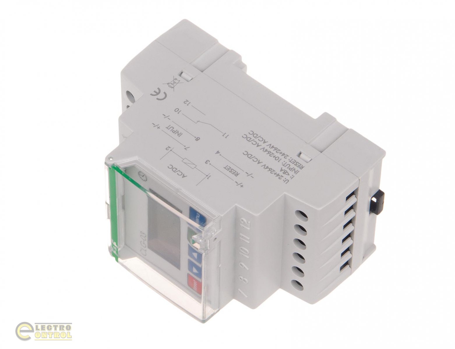 Дія: CLG-03 є програмованим, багатофункційним електронним лічильником, який призначений для підрахунку годин роботи приєднаних пристроїв в діапазоні від 1 до 999 999, що відповідає максимальному діапазону, який становить 114 років. Час роботи підраховується відповідно до індивідуальної програми, встановленої користувачем. По досягненню максимального значення лічильник виконає функцію, зконфігуровану згідно індивідуальних потреб користувача.