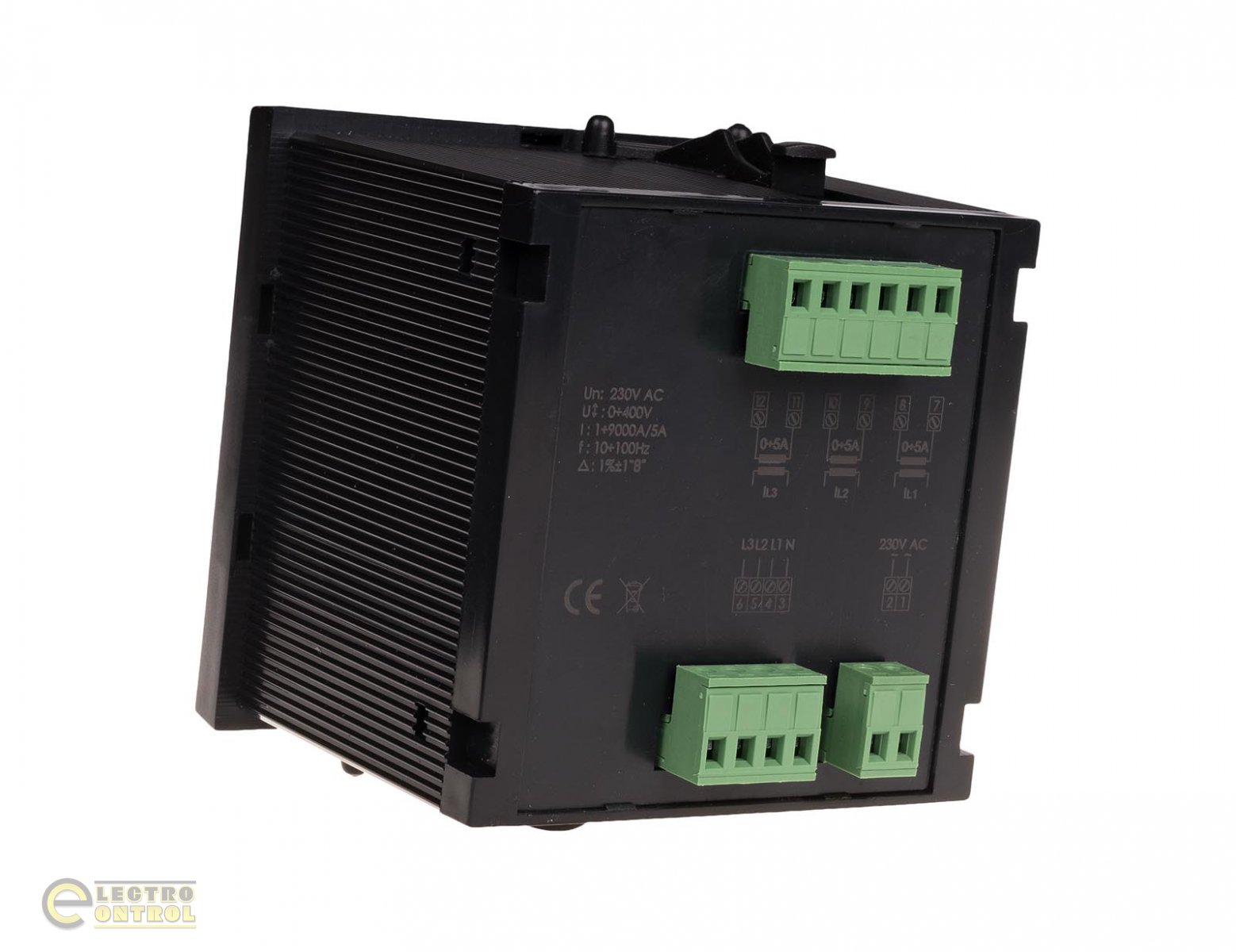 Мультиметр показує поточні навантаження всіх трьох фаз, обраних користувачем, напруга однофазна або міжфазова та частота. Вибір параметру відбувається кнопкою, розташованою праворуч від індикатора напруги. Горизонтальна лінія – з лівого боку індикатора напруги визначає фазу, для якої ми проводимо читання фазового напруги. Дві горизонтальні лінії = з лівої сторони індикатора напруги визначають фази, для яких ми виконуємо читання напруги міжфазової.