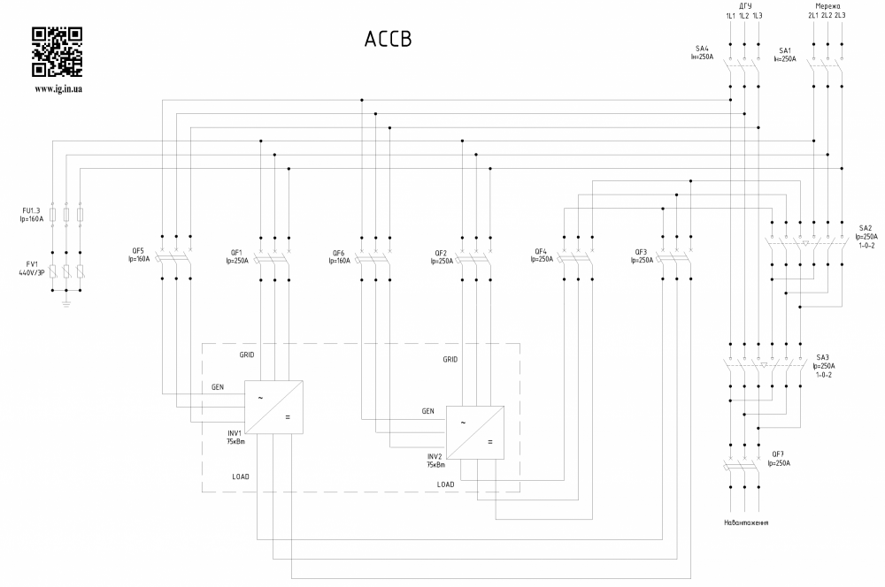 Комутація джерел живлення: за допомогою рубильників / вимикачів навантаження SA1, SA4 виконується ручне підключення мережі або ДГУ. Робота з інверторами (INV1, INV2 по 75 кВт): інвертори можуть працювати в режимах GRID / GEN / LOAD. Забезпечується підключення інверторів як до мережі, так і до ДГУ. Формування вихідного живлення для навантаження через інверторний тракт.