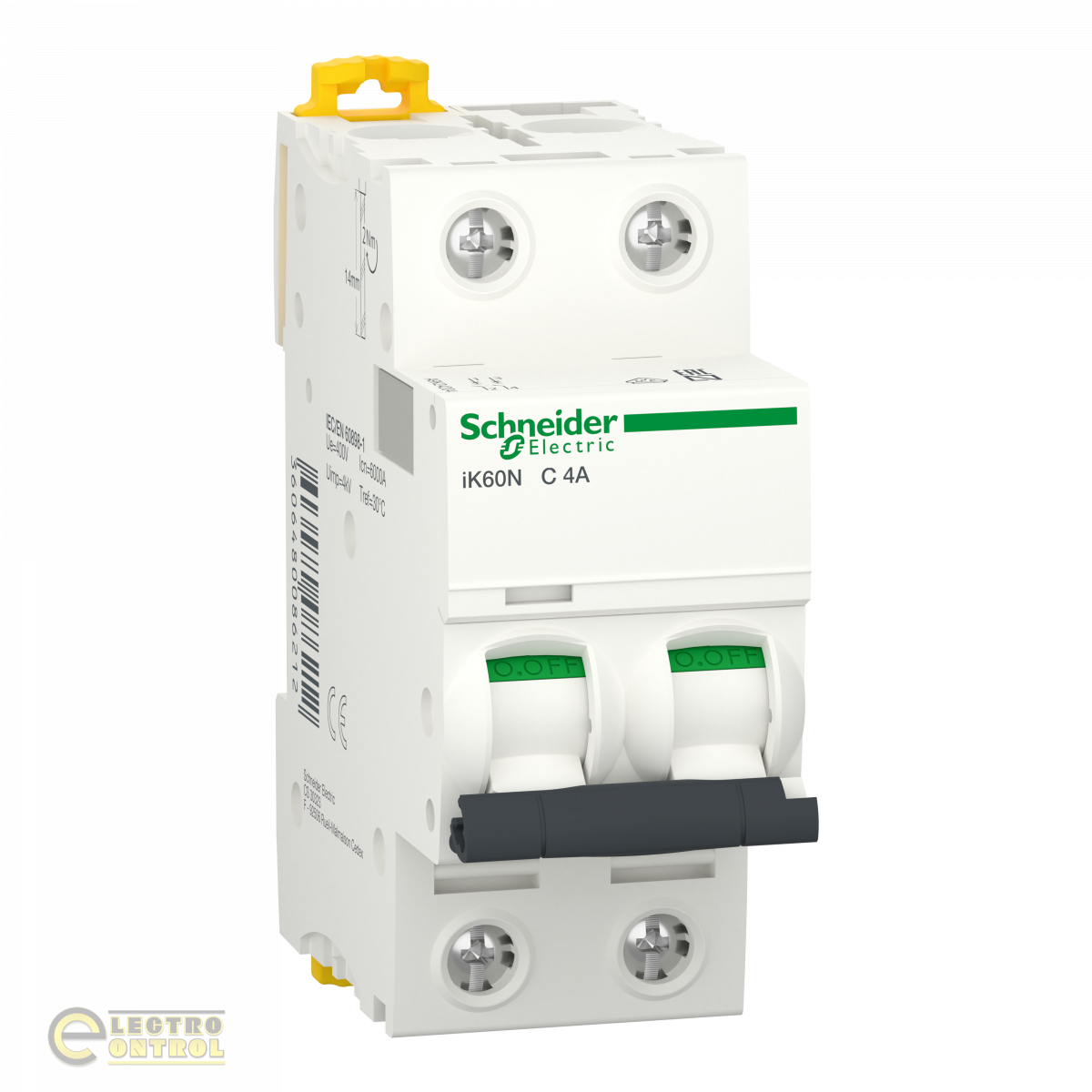Acti9 iK60N є низьковольтним модульним автоматичним вимикачем (АВ). Це автоматичний вимикач 2P з 2 захищеними полюсами, номінальним струмом 4A і кривою відключення С. Номінальна відключаюча здатність при короткому замиканні складає 6000 А при 230 В змінного струму відповідно до стандарту МЕК 60898-1. Автоматичний вимикач захищає електричне коло від струмів короткого замикання та перевантаження. Він має подвійне кріплення для швидкого демонтажу разом із гребінчастою шинкою. Він має електричну стійкість до 10000 циклів і механічну стійкість до 20000 циклів. Робоча напруга Ue становить 230 В змінного струму. Номінальна напруга ізоляції Ui становить 440 В змінного струму. Номінальна імпульсна витримувана напруга Uimp становить 4 кВ. Робоча частота 50 Гц або 60 Гц. Він може бути встановлений на DIN-рейку для модульної установки. Його ширина становить 4 модулі по 9 мм. Колір виробу білий (RAL9003). Розміри: (Ш) 36 мм x (В) 85 мм x (Г) 78,5 мм. Вага 200г. Має ступінь захисту IP20. Має ступінь захисту IP40 при встановленні у модульному щиті відповідно до стандарту МЕК 60529. Робоча температура від -25°C до 60°C. Температура зберігання від -40°C до 85°C.