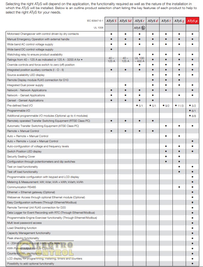 В автоматичному режимі ATyS p здійснює безперервний контроль двох джерел живлення та перемикає навантаження відповідно до заданих параметрів, які налаштовуються через вбудований РК-дисплей або за допомогою засобів зв’язку. Пристрої поєднують у собі всі функції серій ATyS t та ATyS g і додатково орієнтовані на керування енергією та інтеграцію в системи моніторингу.