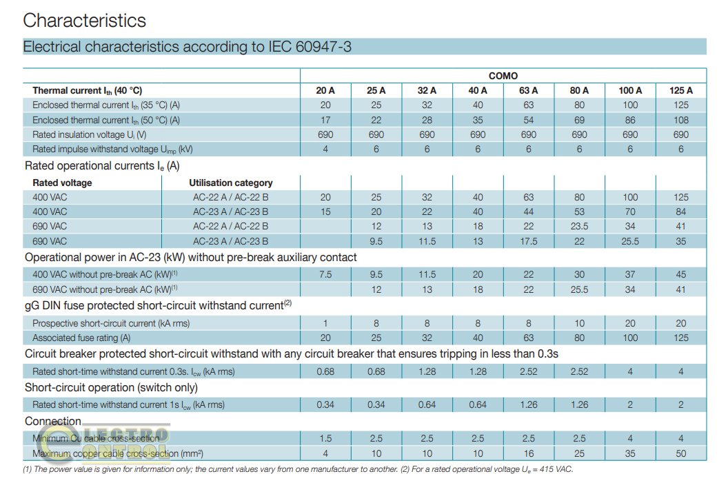 Серія COMO забезпечує комутацію під навантаженням та гарантований розрив кола. У лінійці представлені моделі на струми 20, 32, 63, 80, 100 та 125 А. Доступні варіанти з різною кількістю полюсів: 3P, 4P, а також 6P (для перемикання двошвидкісних двигунів або схем зірка-трикутник).