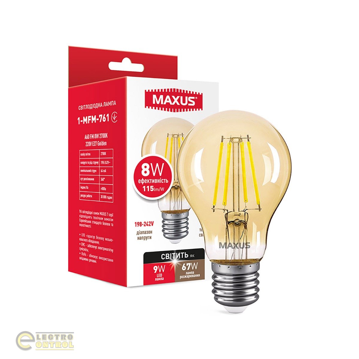 Лампа світлодіодна MAXUS 1-MFM-761 A60 FM 8W 2700K 220V E27 Golden