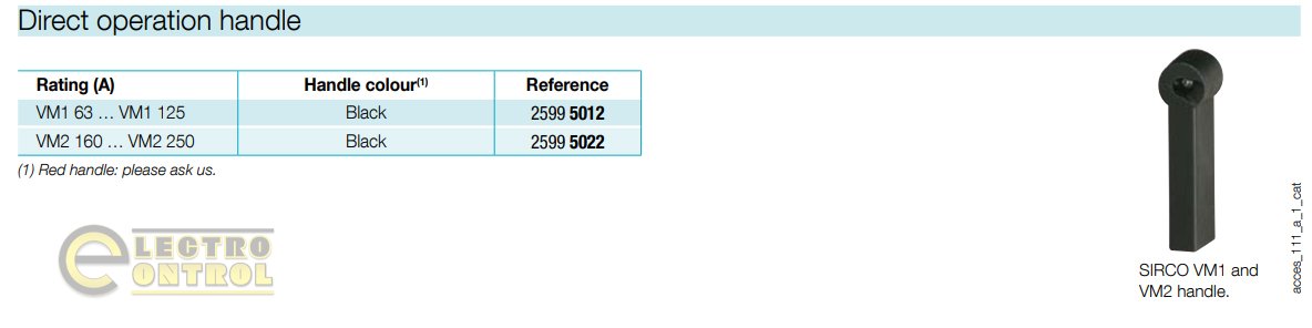 Чорна рукоятка типу VM1 для прямого керування апаратом. Монтується безпосередньо на вимикачі навантаження Sirco VM номіналом 63–125 А. Забезпечує надійне ручне керування на корпусі пристрою.