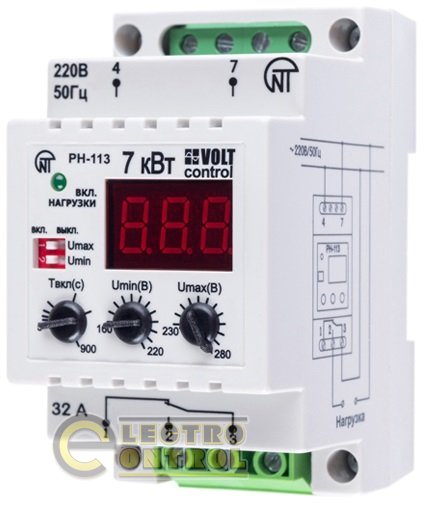 На сайте eсshop (Электроконтроль) Вы можете подобрать и купить реле напряжения РН-113. Прибор предназначен для защиты и мгновенного отключения однофазной нагрузки бытового и промышленного оборудования любой мощности, при сильных колебаниях в электрических сетях с последующим повторным включением при нормализации параметров. Если мощность ниже 7 кВт (32А) питание от сети отключается выходными контактами реле, выше 7 кВт (32А) с помощью магнитного пускателя , не входящего в комплект реле РН-113.